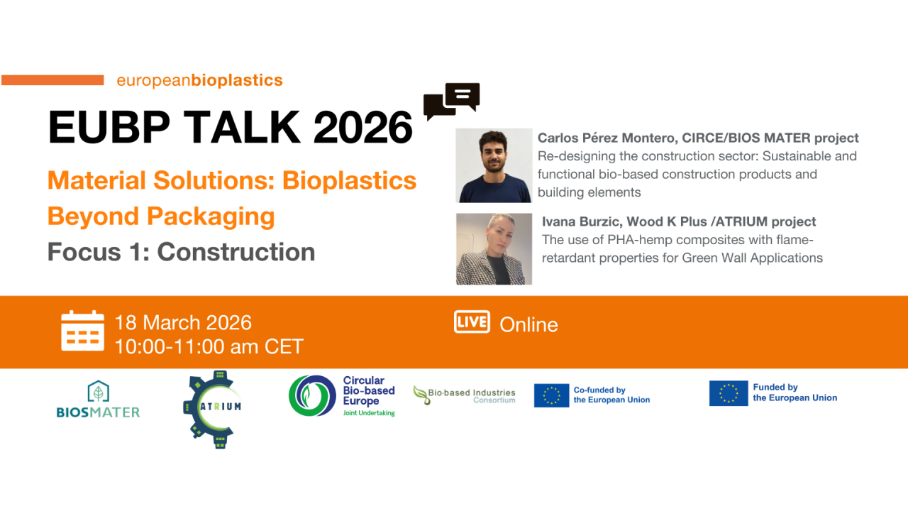 BIOS MATER was recently showcased at EUBP Talk #1: Material Solutions – Bioplastics Beyond Packaging: Construction, part of the talk series organised by European Bioplastics. The event brought together researchers, organisations, and industry representatives to exchange insights on emerging applications of bioplastics across sectors, with a dedicated focus on the construction industry.